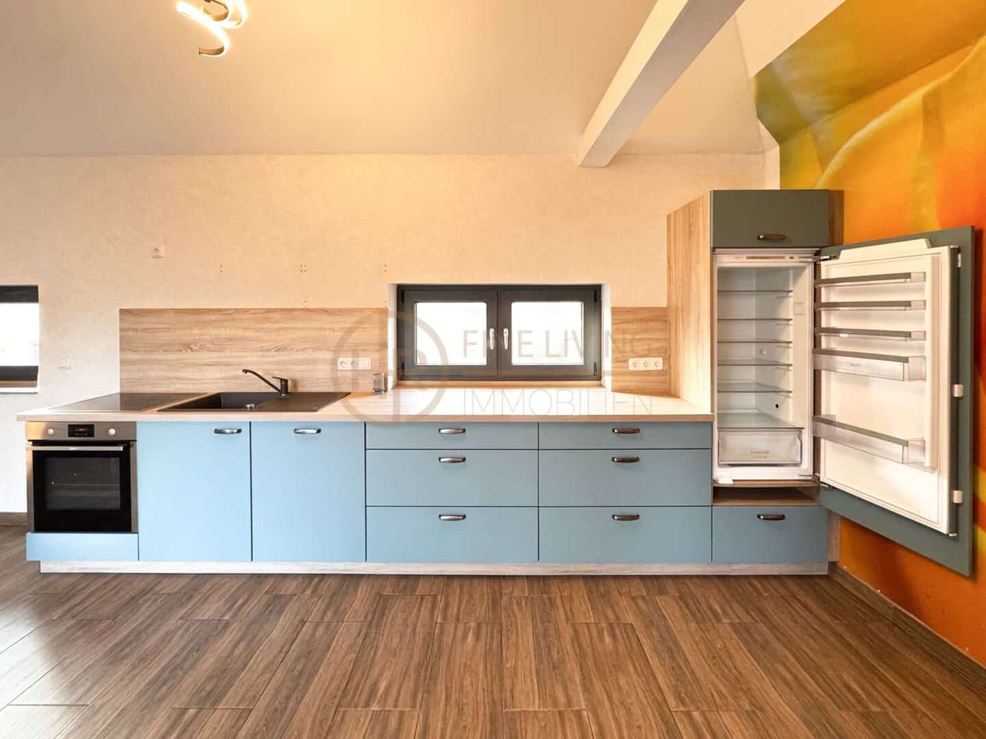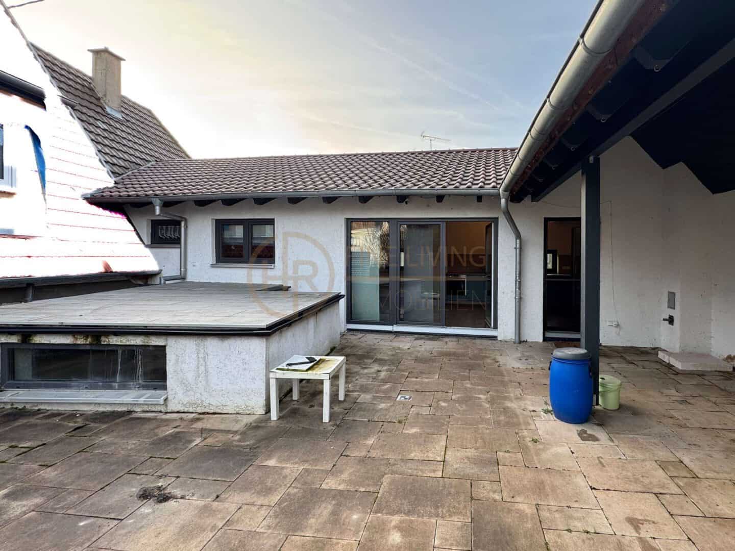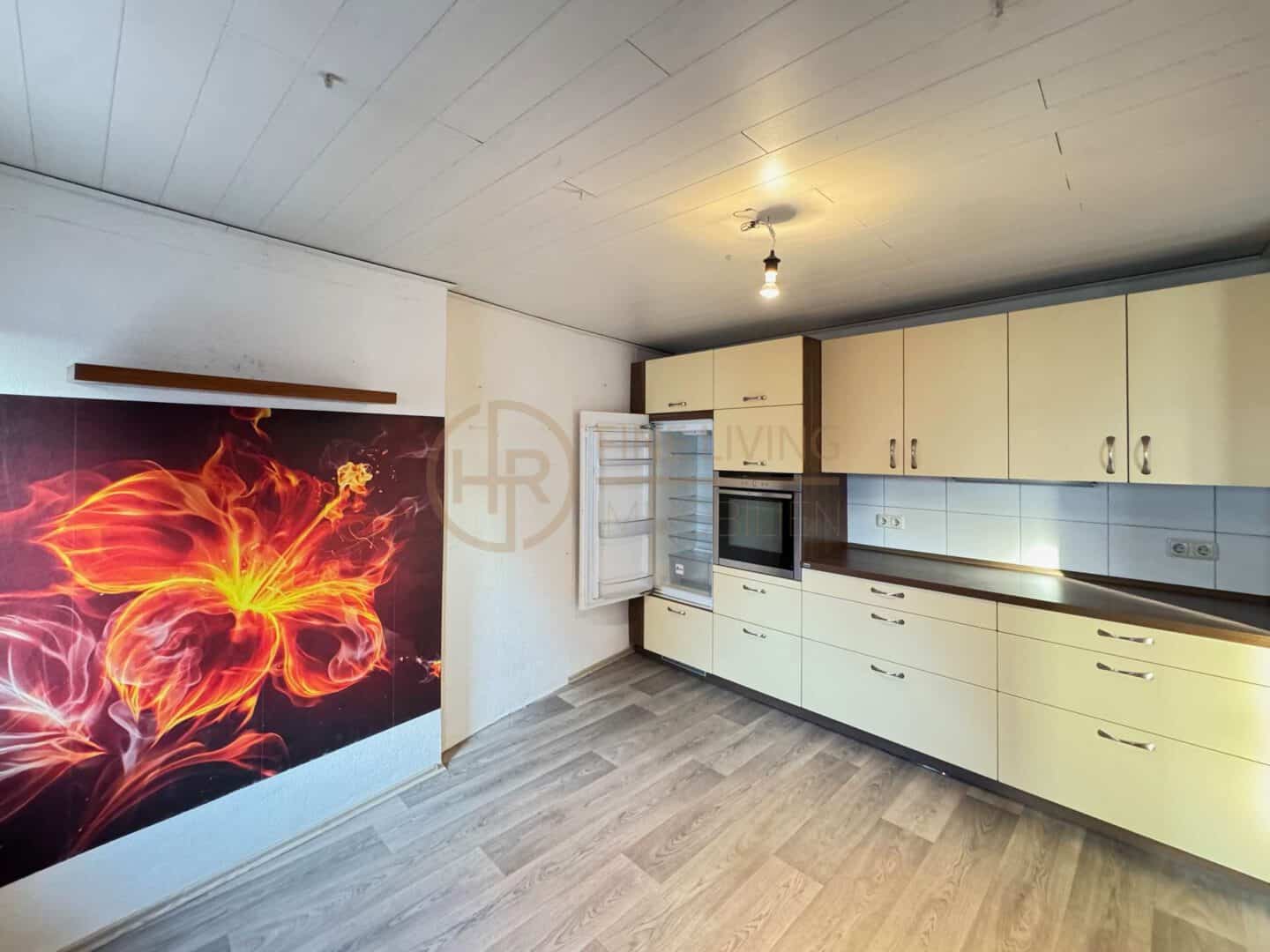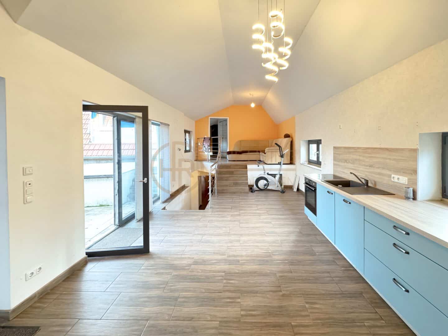 Das Herzstück des Hauses ist der offene Wohn- und Essbereich im 1. Obergeschoss des Neubaus. Die außergewöhnliche Deckenhöhe von ca. 3,42 m, viel Tageslicht und die integrierte Sommerküche machen diesen Raum zum natürlichen Treffpunkt der Familie. Von hier aus gelangen Sie direkt auf die Terrasse und in den Garten – perfekt für spielende Kinder, Grillabende und entspannte Stunden im Freien.