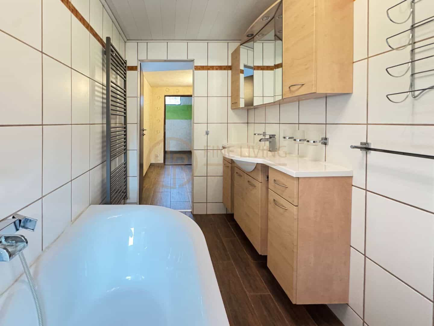 Zwei modernisierte Badezimmer – eines mit großzügiger Dusche, eines mit Badewanne – erleichtern den Familienalltag. Die Fußbodenheizung im Neubau, pflegeleichte Bodenbeläge aus Fliesen, Vinyl und Laminat, Kunststofffenster mit 3-fach-Verglasung sowie eine Wasserenthärtungsanlage sorgen für zeitgemäßen Wohnkomfort. Beheizt wird das Haus über eine Öl-Zentralheizung (Brenner Baujahr 1999). Die Immobilie erreicht die Energieeffizienzklasse D mit einem Verbrauch von 123,4 kWh/(m²·a).